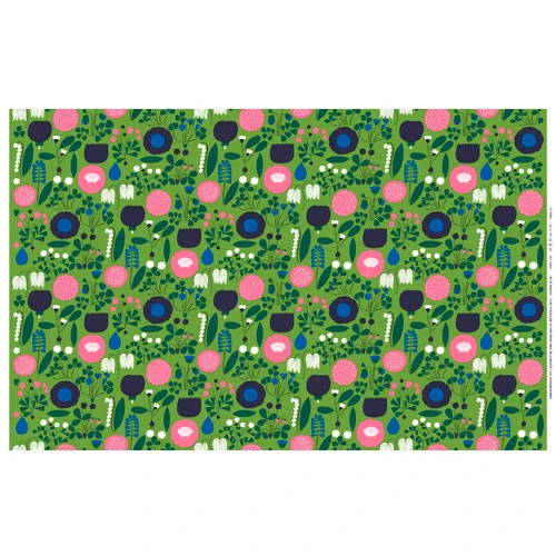 Bring the freshness of a summer field into your home with the Marimekko Ahonlaita Green PVC Fabric. Inspired by the blossoms that line the edge of meadows, Aino-Maija Metsola interprets her vision into the Ahonlaita pattern. Pops of pink, purple, white and navy wild flowers blanket a green background. The PVC coating on the fabric makes cleaning a snap. Swap out your cool winter tones for this vibrant, summery fabric that is perfect for your home or patio.