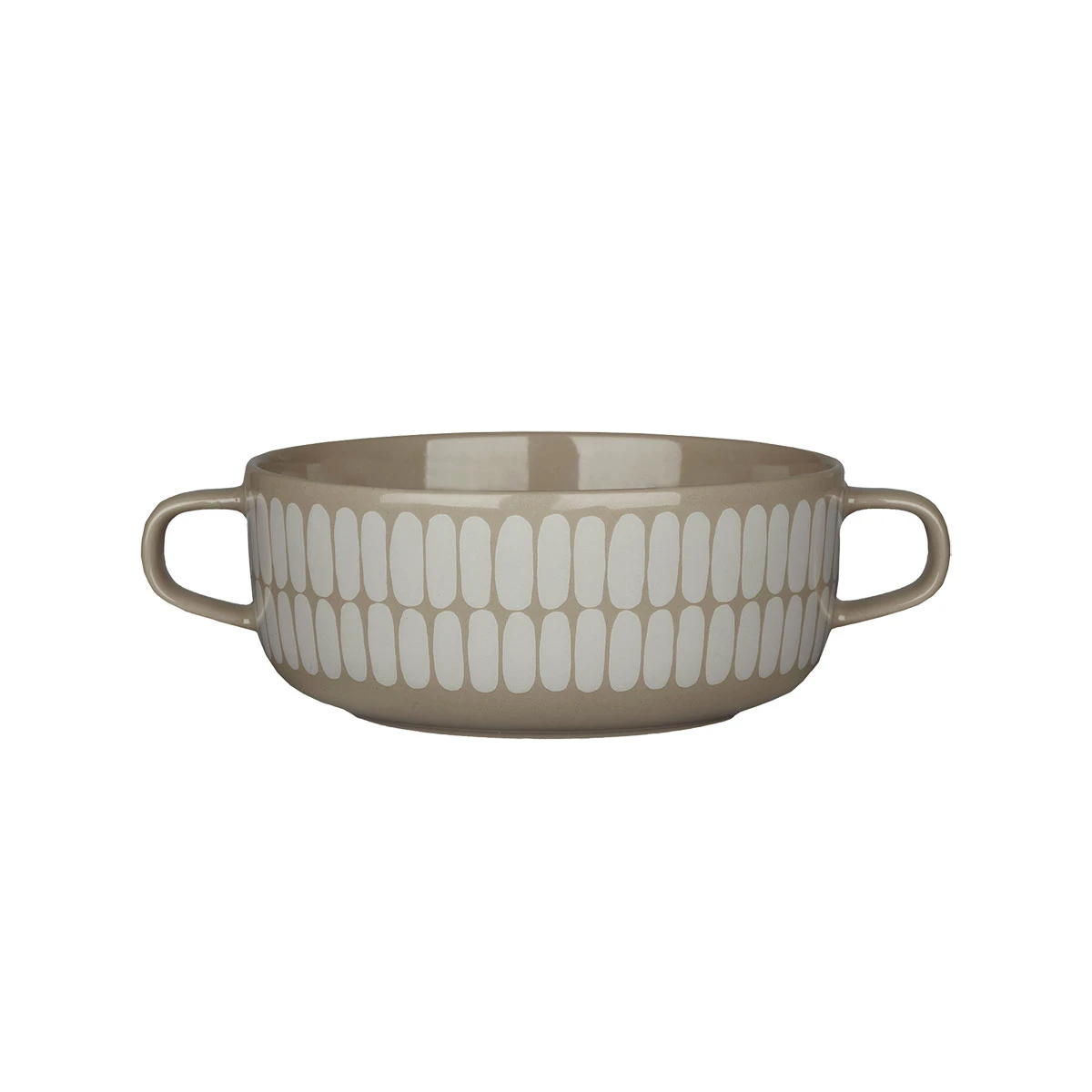 Simple yet eye-catching, Maija Loukari’s Alku (beginning) pattern features consistent, bean-like shapes to represent seeds that flourish into beautiful, vast flowers. Atop this small bowl with handles, the classic design and terra / white colorway will bring an earthy warmth to the table setting. The size makes this piece perfect for cereal, assorted snacks, dips and more, while the handles make for easy and safe movement. The brown stoneware is microwave, oven, freezer and dishwasher safe for convenient, everyday use.