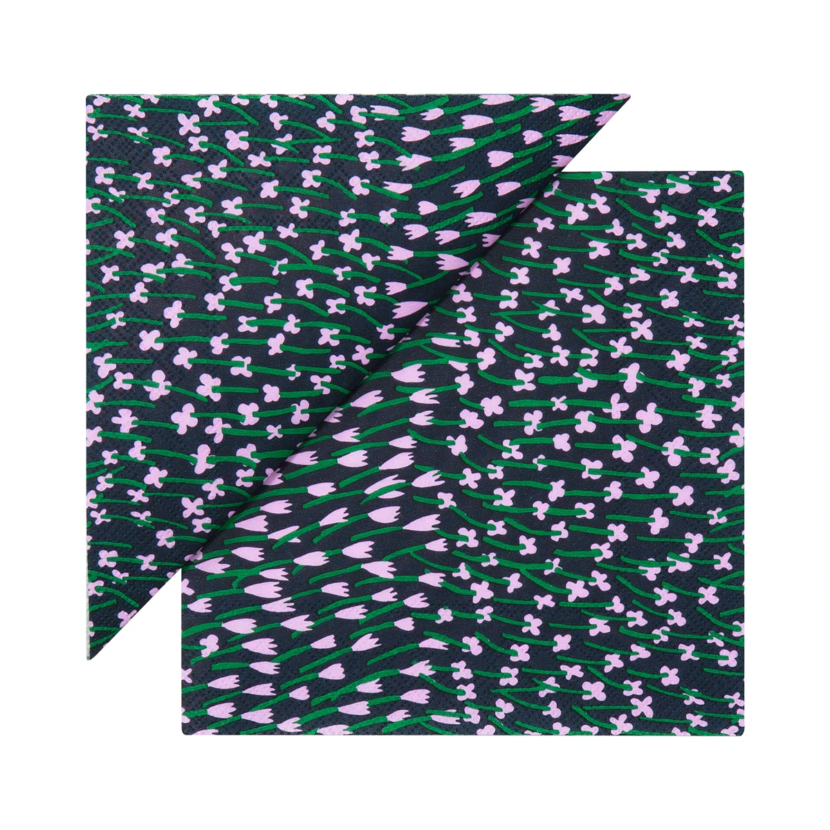 The idea for the Apilainen (Small Clover) pattern came to designer Lotta Maija while at her summer cottage. An easterly wind brought big waves to shore, causing the yard’s flowery grass to sway back and forth in a memorable way. Dine with fields of flowers using this pack of 20 Marimekko napkins. Printed with non-toxic water-based colors on recycled tissue, these 100% biodegradable napkins are a more eco-friendly way to enjoy the convenience of disposable napkins. The pack of 20 3-ply paper napkins is the perfect way to bring personality to a party or fun to everyday dining.