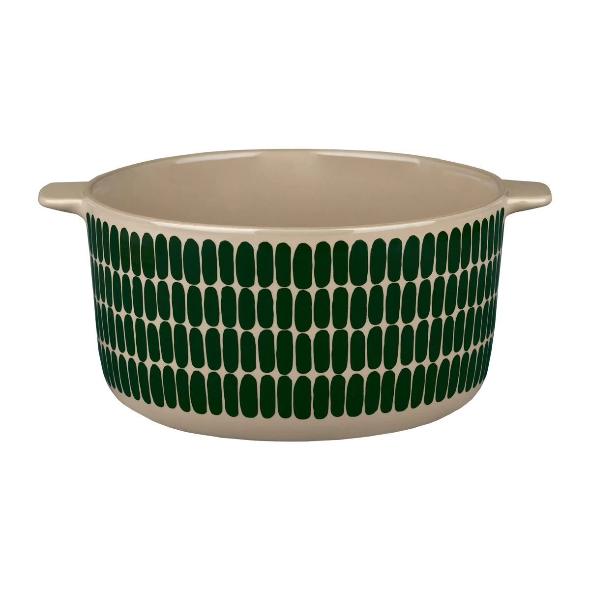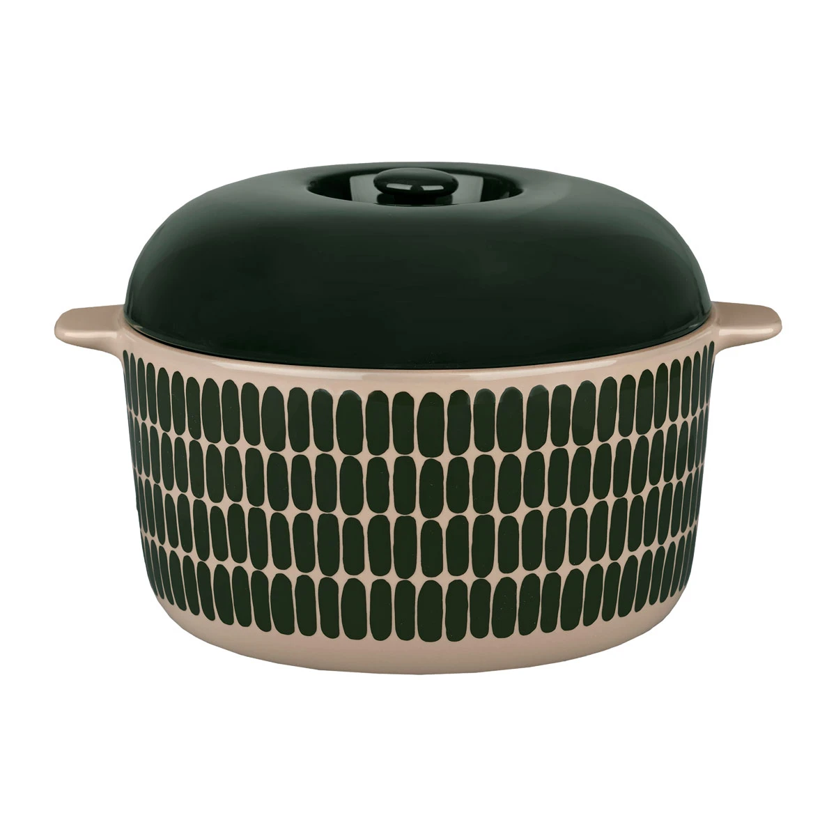 The charming Alku (beginning) pattern adorns this lovely and versatile 2-liter pot. Marimekko’s Alku pot is suitable for everything from preparation to presentation. Use it to slow cook stews and other one-pot meals, and then as a beautiful serving vessel. Made from dishwasher, oven, and microwave safe ceramic, this pot features the dark green Alku pattern against earthy terra brown with a matching dark green lid. This large pot is part of the Oiva collection and looks great alongside any Marimekko stoneware.
