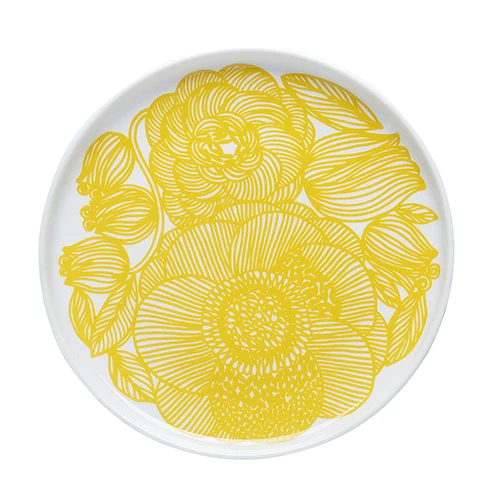 The perfect portion for a light lunch, the Marimekko Kurjenpolvi White/Yellow Salad Plate makes a stylish and sensible addition to any dinnerware collection. This dish will instantly brighten the table setting with Aino-Maija Metsola’s light and airy “Geranium” pattern, beaming up at you in a sunny shade of yellow. Conveniently dishwasher, microwave, oven and freezer safe, this porcelain piece will get more than its fair share of use. Invest in a set of these pretty and practical plates for a collection that will never collect dust in the back of the cupboard.