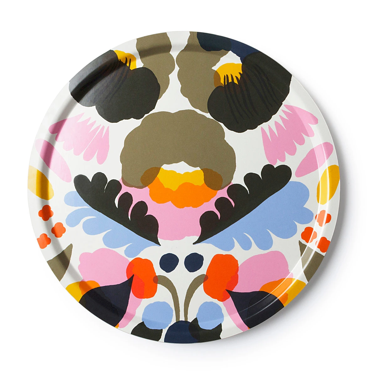 Serve a crowd in smart style with the Marimekko Hattarakukka Round Tray. The laminated plywood is food-safe, shatterproof and waterproof. Boldly colored, Aino-Maija Metsola’s Hattarakukka pattern also allows this tray to serve as tabletop art and a place for produce, magazines or other odds and ends.