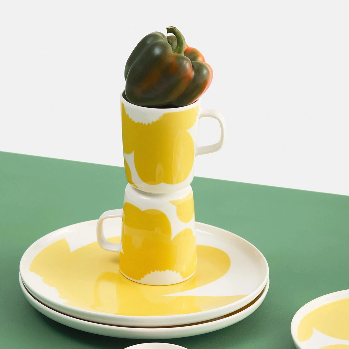 This Marimekko dinner plate features a large-scale and abstract variation of Maija Isola’s iconic poppies from 1964. Called Iso Unikko (Big Poppy), the vibrant yellow colorway is reminiscent of the warmth and sunshine of spring, bringing joy to any kitchen atmosphere. The large size will be ideal for dinner entrees, as the name suggests, as well as everyday meals and snacks. Add to an existing collection of Marimekko Unikko dinnerware, or pair it with the rest of the matching Iso Unikko Spring Yellow dinnerware to create a fun and cohesive set. The plate is made of microwave, oven, freezer and dishwasher safe white stoneware for long-lasting use.