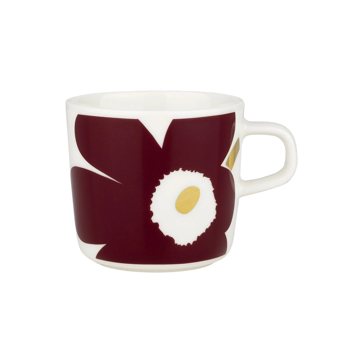 The Unikko (Poppy) Juhla (Celebration) coffee cup is made with white stoneware. The poppy pattern mug is filled with rich maroon coloring and shimmering gold accents. Marimekkko’s famous poppy pattern Unikko was made in 1964 and represents creativity. Be sure to handwash this mug and do not put it in the microwave. Additionally, remove the stickers before using this product.