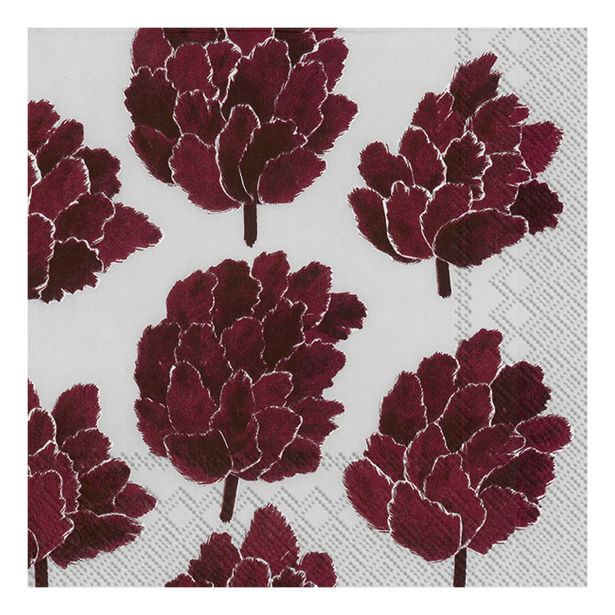 Designed by Carina Seth Andersson, the Käpykukka (Pinecone Flower) print is a sophisticated take on traditional festive patterns. In a rich Bordeaux wine color atop a light icy grey, this wintry design is perfect for setting out on a holiday buffet table. The 100% biodegradable napkins are printed with non-toxic, water soluble colors on recycled tissue for a more eco-friendly way to enjoy the convenience of paper.