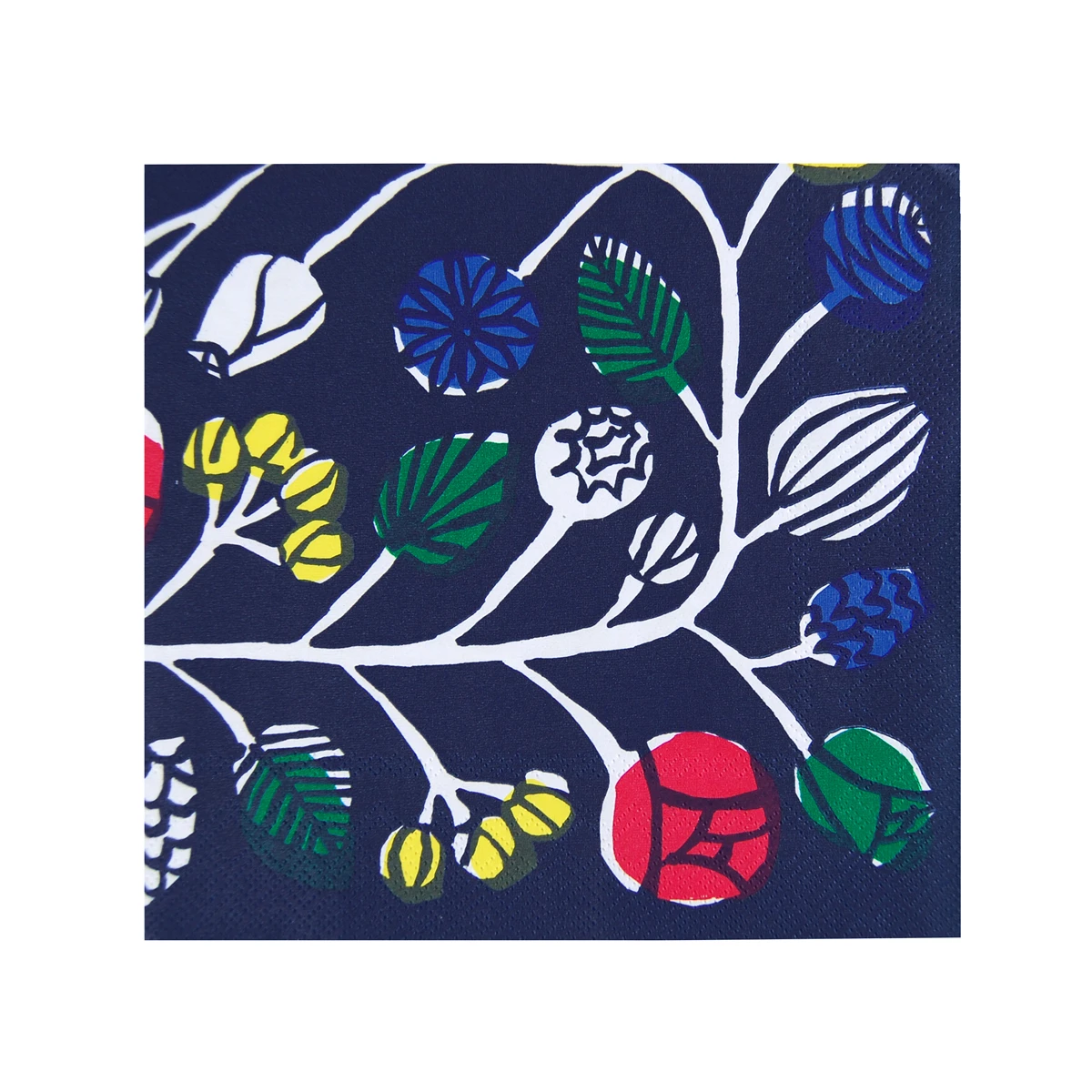 Red, green and yellow blossoms bloom on the Marimekko Kranssi Blue Lunch Napkins as part of Masara Suzuki’s Kranssi (Wreath) pattern. Beautiful for the holidays and beyond, these stylish squares will create a picturesque and practical place setting. Printed with non-toxic, water-based colors on recycled tissue, these 100% biodegradable napkins are a more eco-friendly way to enjoy the convenience of disposable napkins