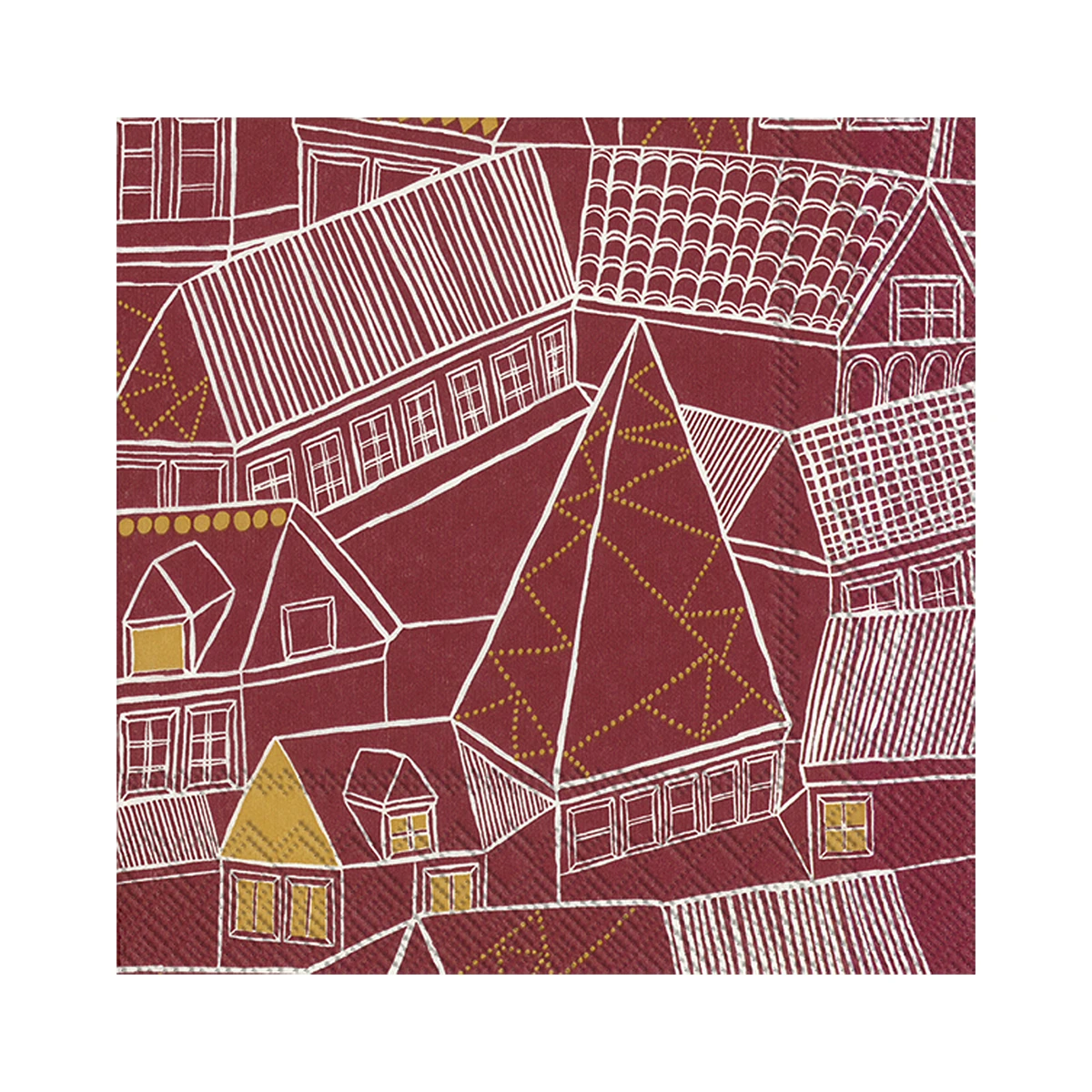 Called Kujiila, this print by Aino-Maija Metsola depicts a charming town with white linework on a maroon backdrop with pops of glowing gold. Printed with non-toxic water-based colors on recycled tissue, these 100% biodegradable napkins are a more eco-friendly way to enjoy the convenience of disposable napkins. The pack of 20 3-ply paper napkins is the perfect way to bring personality to a party or fun to everyday dining.