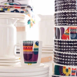 Raise the enjoyment level of your next cup of coffee or tea with the Marimekko Kukkuluuruu Mug. Smooth and sturdy, the creamy white porcelain mug designed by Sami Ruotsalainen serves as an ideal backdrop for designer Sanna Annukka’s whimsy folkloric motif. The playful and colorful pattern was inspired by Karelian heritage and features geometric animal illustrations. Enjoy your favorite warm beverage any time of year with this microwave, oven, dishwasher and freezer safe mug. It also makes a great hostess or coworker gift.