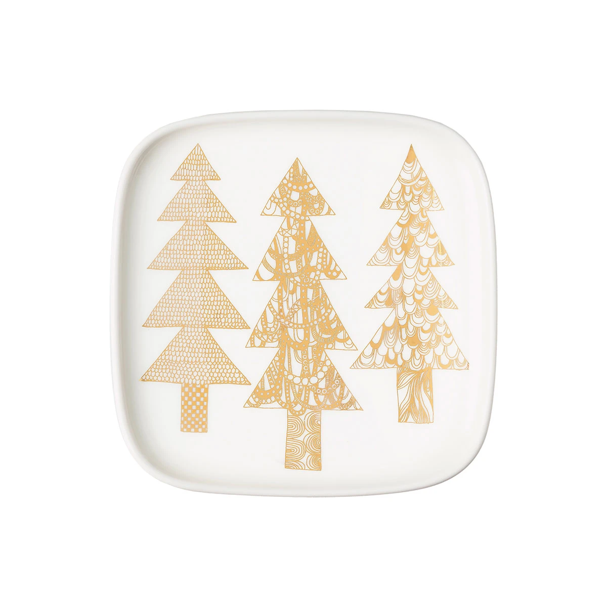 The Kuusikossa (Spruce) pattern designed by Maija Louekari takes you into a magical forest where each tree is unique and special. The design is made from a metallic gold color that gives of a bright shimmer when brought into the light. This small square plate perfectly compliments a Marimekko coffee or tea mug. This plate consists of round edges and a small lip. Use it as a saucer or alone as an appetizer or dessert plate.