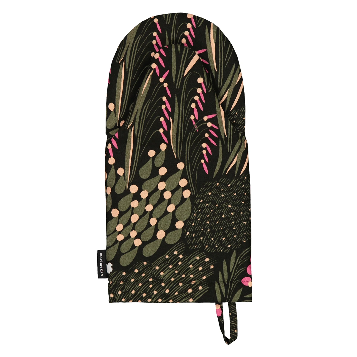 The deepest possible green acts as an intriguing and earthy backdrop for the flora of Aino-Maija Metsola’s Letto pattern. Leaves and berries in shades of brown, sage, magenta, peach,yellow, and white turn this oven mitt into functional art. The exterior is made from 100% cotton, while the inside is padded for flexible heat protection. When not cooking or baking, hang it from the attached loop to display the lovely Marimekko artwork.