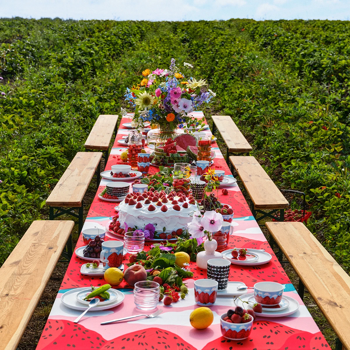 Why not serve up strawberries in this petite bowl? Made from white stoneware, it is conveniently microwave, oven, freezer and dishwasher safe. Finnish for “Strawberry Hills”, the 1969 Mansikkavuoret pattern was designed by Maija Isola in 1969. Two years prior, the songs “Strawberry Fields” and “Lucy in the Sky with Diamonds” were released and inspired this delicious design. The strongly saturated colors and pop art imagery feels as fresh as it did during the peak of its popularity in the late ’60s.