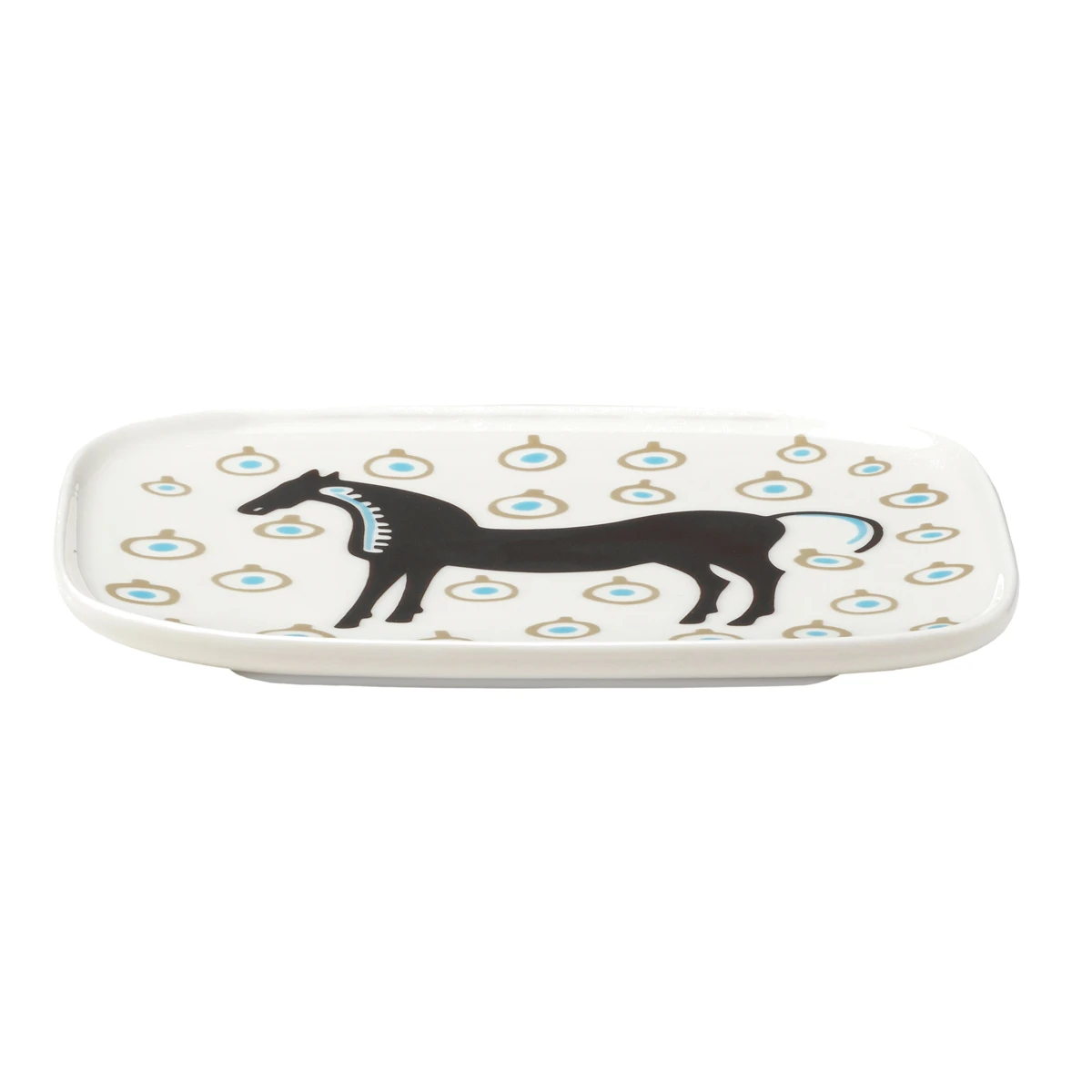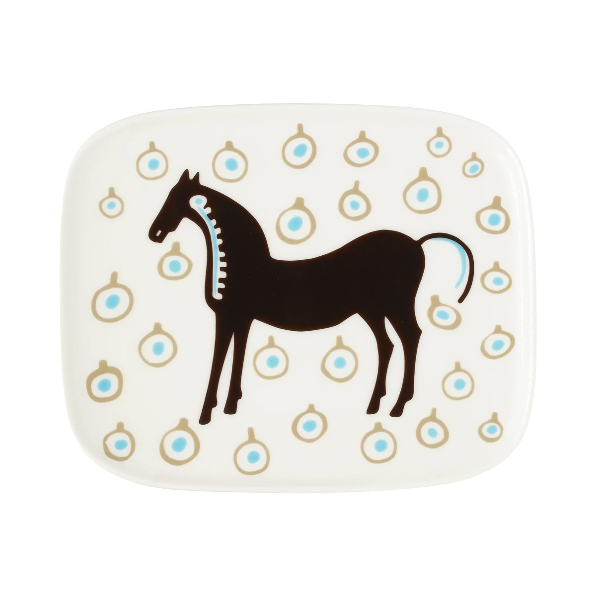 Designer Maija Isola had a dream about running with wild horses in the forest, and was inspired to create this folkloric print. Fittingly named Musta Tamma (Black Mare), it depicts beautiful dark brown horses with beige and turquoise apples. Suitable as a saucer, appetizer or dessert plate, the Marimekko Small Plate will make for a pretty presentation of whatever you put on it. Dishwasher, microwave, oven and freezer safe, the white stoneware is as functional as it is beautiful.
