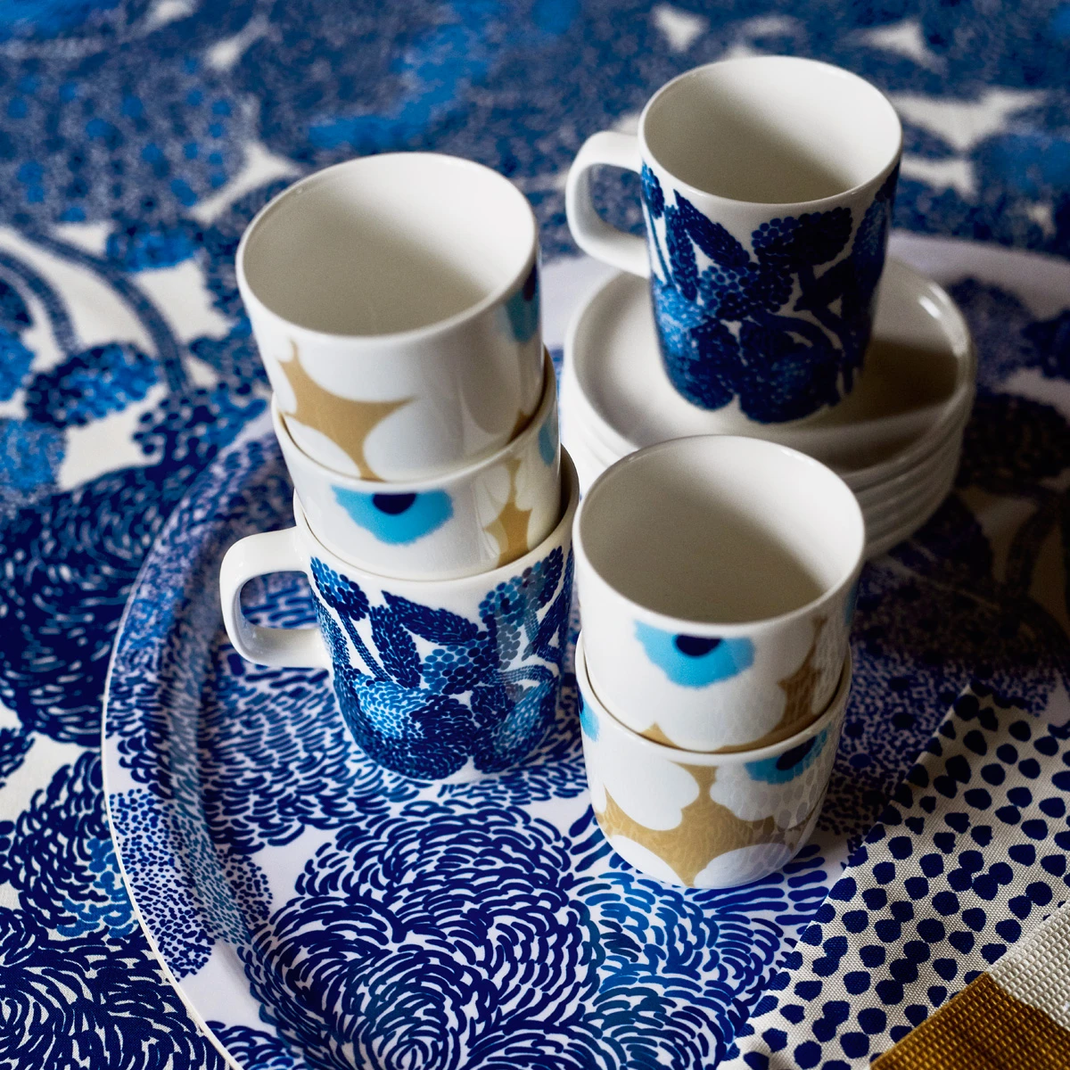 Whether it’s hot cocoa, coffee, or tea, your favorite warm beverage will be even more delightful a treat in this Marimekko mug. It is decorated with the beautiful blue botanicals of Aino-Maija Metsola’s Mynsteri pattern. Like all Marimekko dinnerware, this porcelain piece is microwave, oven, freezer, and dishwasher safe.