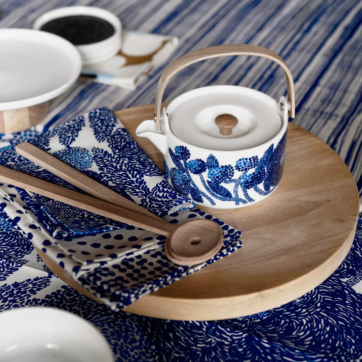 Serve loose leaf tea with style and functionality using this Marimekko teapot. The Mynsteri pattern by Aino-Maija Metsola in blue and white is sure to add cheer to a rainy day, when staying in and making tea for two is just what you need. The piece is made from vitreous porcelain and includes a matching porcelain tea strainer, with a wood handle and lid knob.