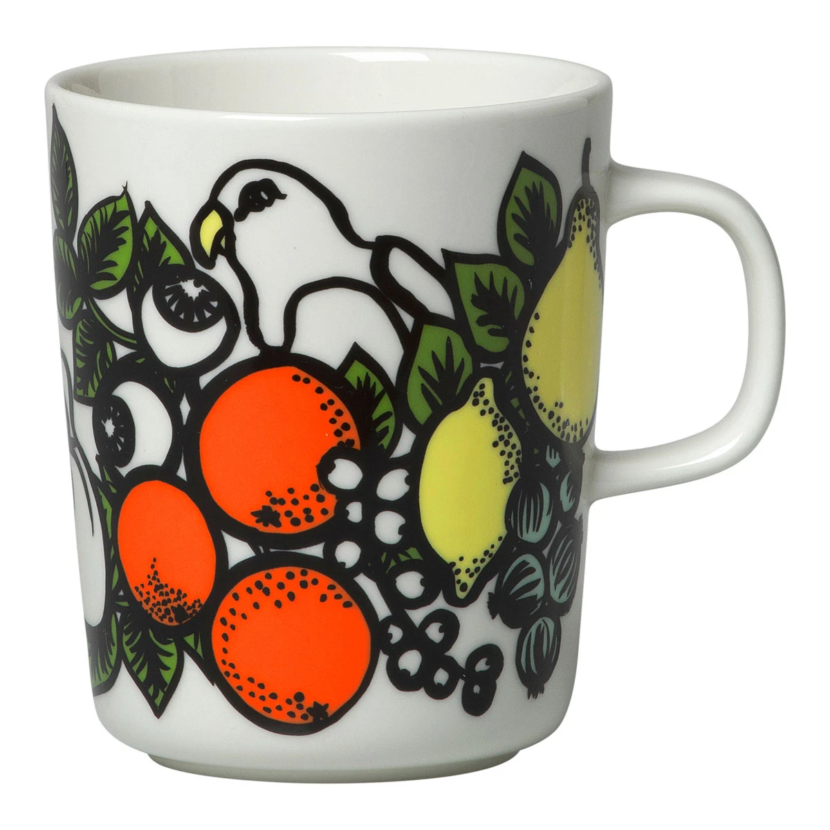 Meaning “Patch Of Sky,” the Pala Taivasta pattern by Maija Louekari captures the yearning for sunshine. In the lush paradise, fruitful greenery, bold blossoms, and a bird can be found coexisting in beautiful harmony. The green, orange, and yellow hues pop against a white backdrop with contrasting black details. Featured on this Marimekko mug, this print will bring joy to morning coffee, afternoon tea, or evening hot chocolate. The white stoneware is conveniently microwave, oven, freezer, and dishwasher safe for everyday use.