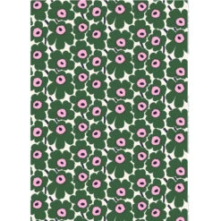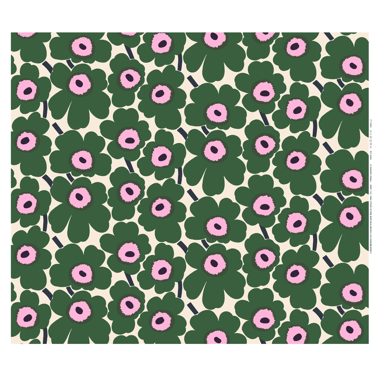 Many design fans around the world revere Unikko as exemplary Marimekko. Dating to 1964, the poppies are now available in green with pink and black accents on a cream backdrop in a Pieni (smaller) scale. The 100% cotton fabric is machine washable, so it is as easy to work with and care for as it is versatile. Make statement drapes, a custom tablecloth, or a one-of-a-kind wall hanging.