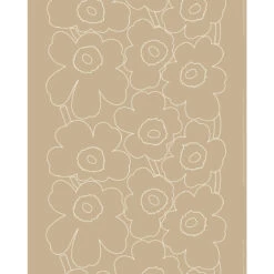 Maija Isola’s 1964 poppies stun as usual on this 100% linen Marimekko fabric, here in an outline-style called Piirto Unikko. The classic poppies are traced in white atop an earthy sand colorway, perfectly fitting any home interior while making a statement with the oversized florals. The print will look stunning when used for larger-scale home decor projects such as curtains, tablecloths, dresses and more. The Marimekko Piirto Unikko fabric is made in Finland and machine washable when needed.
