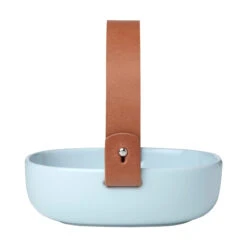 Serve up good cheer with this chic serving dish in a light blue aqua hue. It’s yet another classic design by Sami Ruostsalainen to complete your table setting. You’ll love to pass this serving dish around by the rich brown leather handle, and passing it down the generations thanks to its timeless style and quality construction. The smooth surface will be a beautiful backdrop to whatever family favorite recipe it holds. Made from white stoneware, the dish portion is microwave, oven, freezer, and dishwasher safe.