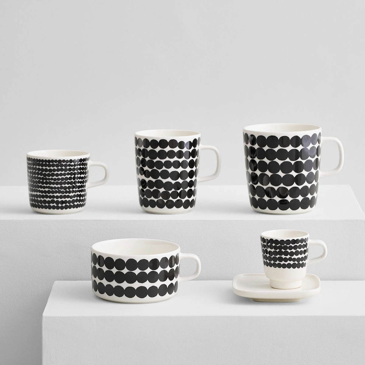 The R�symatto coffee cup is part of the Marimekko Oiva dinnerware collection and features the graphic “rag rug” pattern. Tiny circles link together around the cup, which has a unique rectangular handle. R�symatto is Finnish for “rag rug”, and the design is meant to mimic the geometric pattern found in traditional woven Finnish rugs.