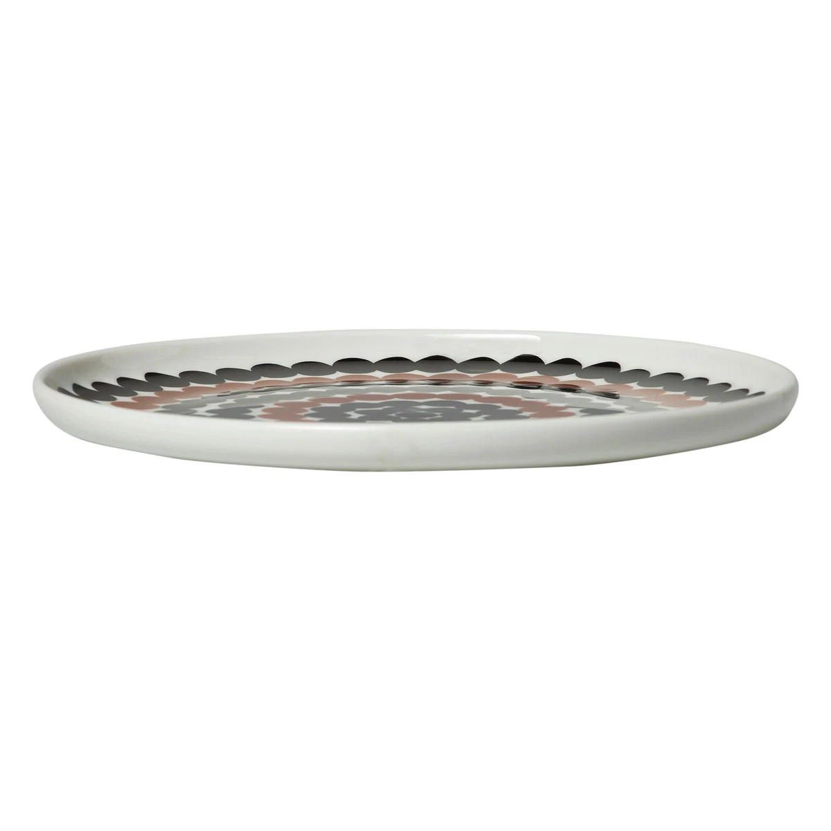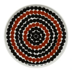 Maija Louekari’s Räsymatto pattern is simple and neutral in warm clay-brown and black, but still undeniably bold. The classic pattern means “Rag Rug” and is meant to mimic the patterns found on traditional Finnish handmade textiles. As the name suggests, this plate is perfect for salads but equally ideal for sandwiches and other small meals. It is made from white stoneware that is microwave, oven, freezer, and dishwasher safe for practical daily use.