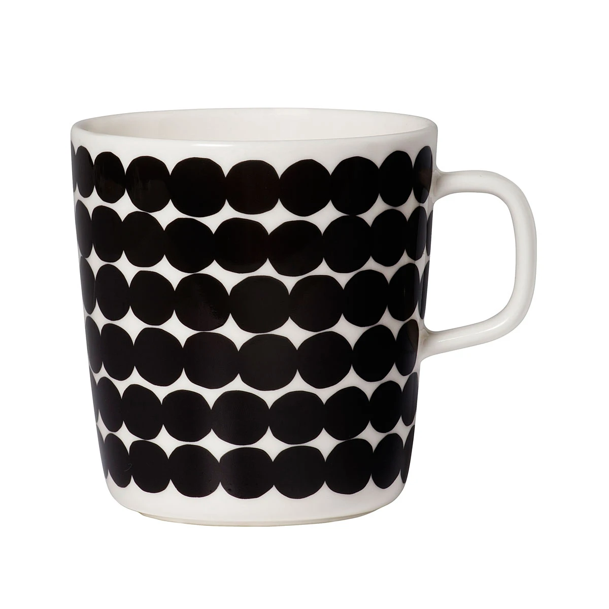 Coffee lovers will be excited about this addition to the Oiva dinnerware collection, a much larger size than the Marimekko mugs collectors may be familiar with. Fit a full 13.5 oz serving of your favorite hot drink in this porcelain piece, which is microwave, oven, dishwasher and freezer safe. The boldly simple Räsymatto mug complements the more detailed elements of the Oiva dinnerware collection by Marimekko. Räsymatto is Finnish for “rag rug”, and the design is meant to mimic the geometric pattern found in such handmade rugs. Black chains of circles encompass the mug, contrasting the angular shape of the handle.