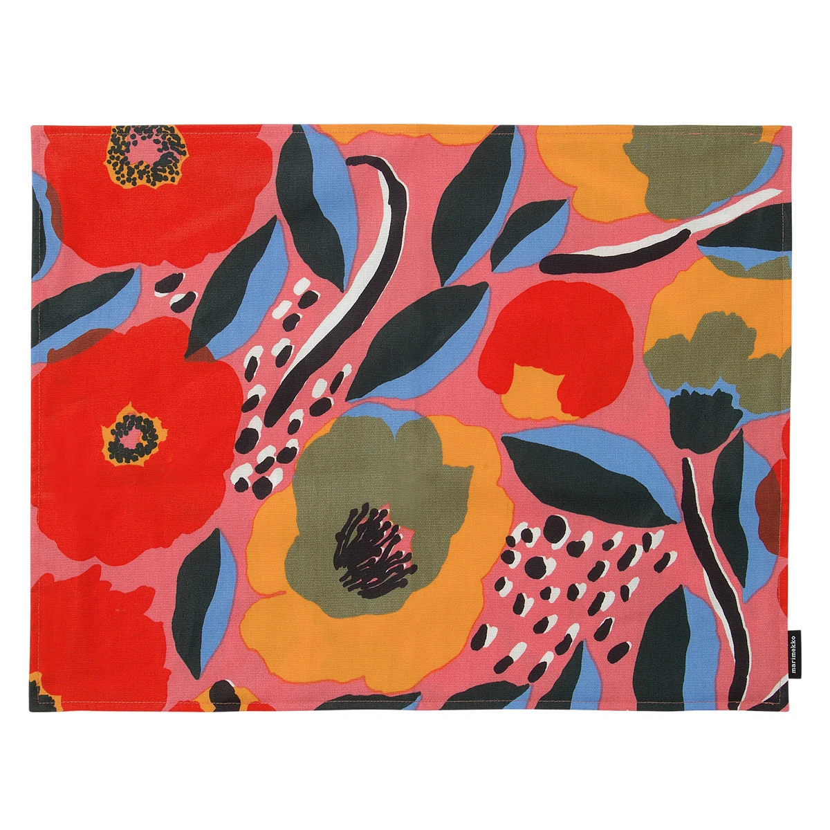 This Marimekko placemat feels like soft and sturdy cotton to the touch, but has been coated in acrylic to stand up to messes.Acrylic-coated cotton makes minor messes easily wiped clean, but also allows it to be machine washable for more major spills. It feels coarser than untreated cotton, but still feels like fabric and not like vinyl of earlier placemats. Plus, the eco-friendly treatment helps to avoid wrinkling when folded! Set a table with this beautiful floral print by Aino-Maija Metsola, fittingly named Rosarium (Rose Garden).