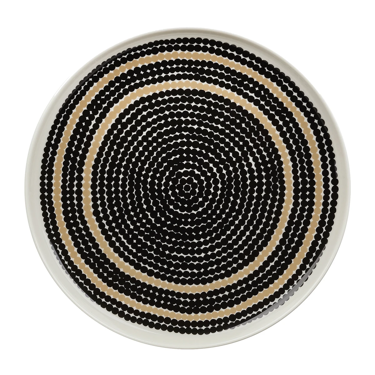 The simplistic Siirtolapuutarha / Räsymatto pattern coupled with a wide, welcoming ceramic design makes this bowl suitable for a variety of uses. Small, imperfect circles form several chains around the surface of the dinner plate, in a black/beige color scheme. Inspired by the texture of a räsymatto, or rag rug, the Marimekko Räsymatto Black / Beige Soup Bowl is part of the Marimekko Oiva dinnerware line and can be mixed with a myriad of other designs and colors for an eclectic collection.