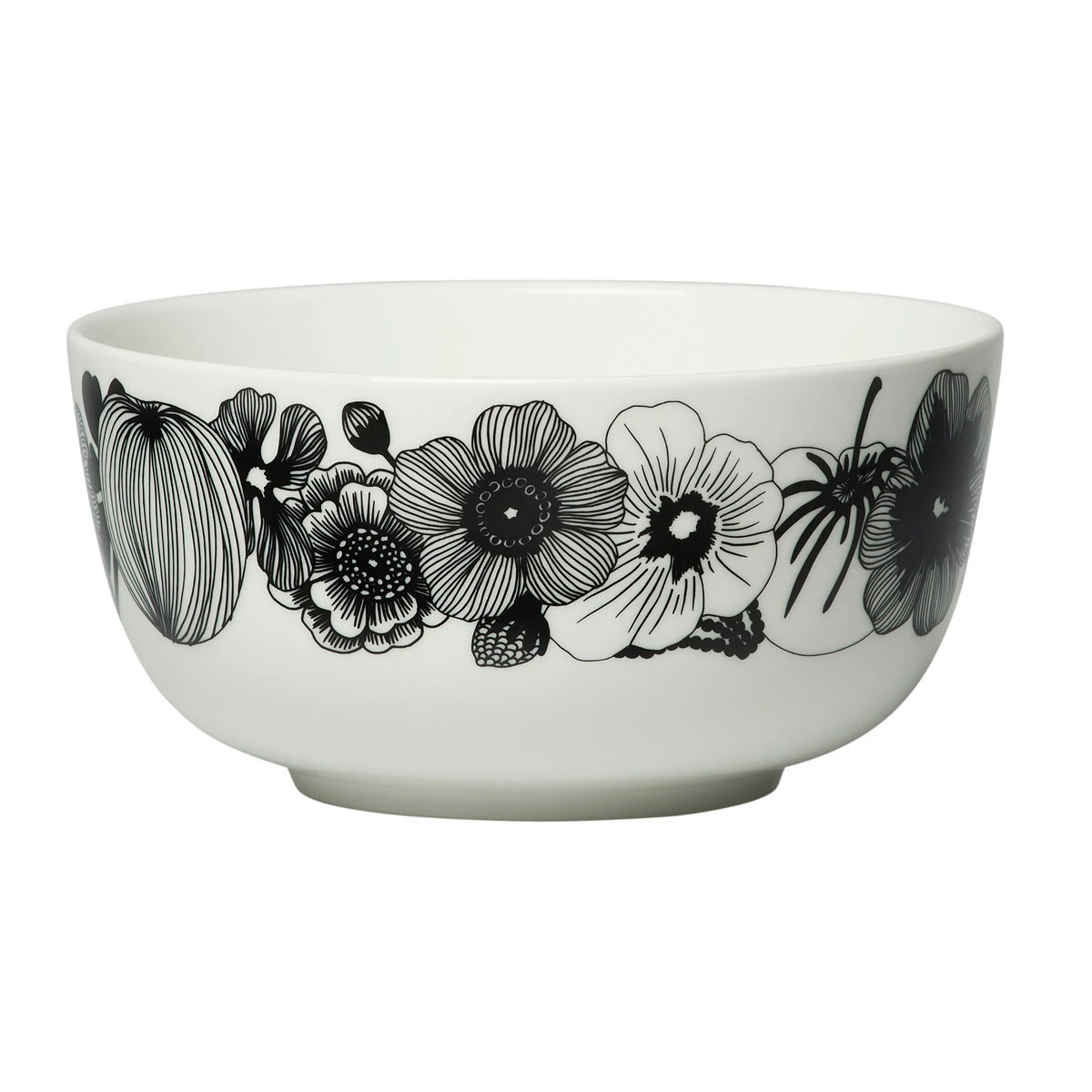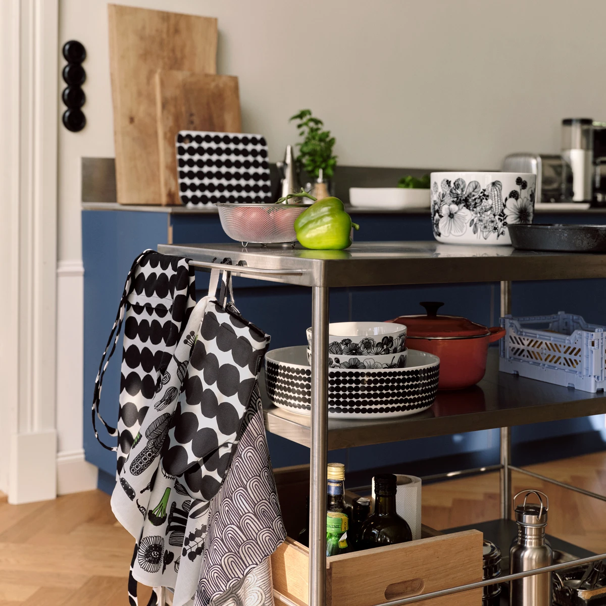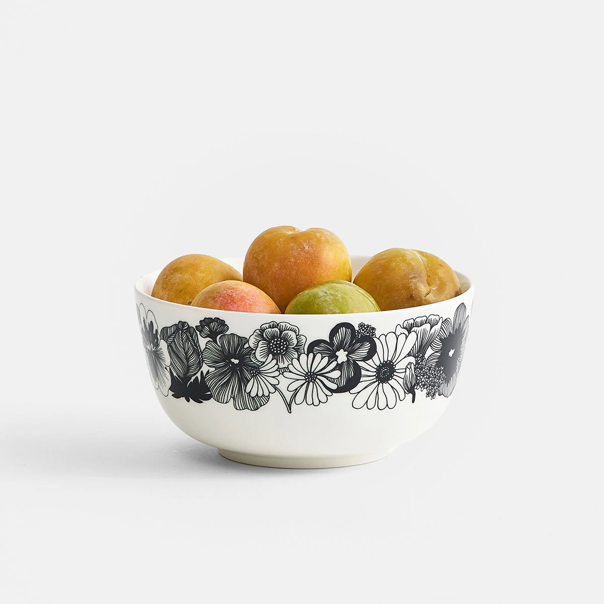 Celebrate the 10 year anniversary of this pattern and the dinnerware line it graces. Flowers and produce serve as an asymmetrical frame for this small Marimekko serving bowl, making it an artistic canvas for your own fresh garden veggies. Called Siirtolapuutarha (City Garden), Maija Isola’s print is a Marimekko favorite and was inspired by rooftop allotments found in the city, mixing urban beauty with nature’s bounty. Made from white stoneware, the small serving bowl is conveniently microwave, oven, freezer, and dishwasher safe.