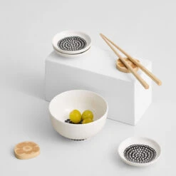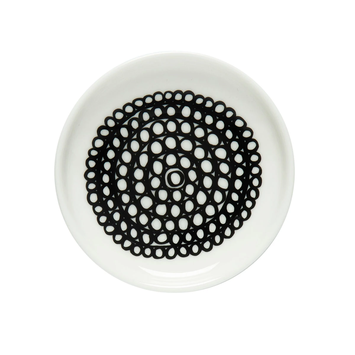 This year, Maija Louekari celebrates her Siirtolapuutarha pattern’s 10 year anniversary. This little lipped plate is perfect for portioning or serving spices, herbs, or sauces. The white stoneware is conveniently microwave, freezer, oven, and dishwasher safe for everyday use. The petite dish has swirled circles in black for a clean and minimal, modern look. It also would make a lovely ring or earring back holder on your dresser or vanity.