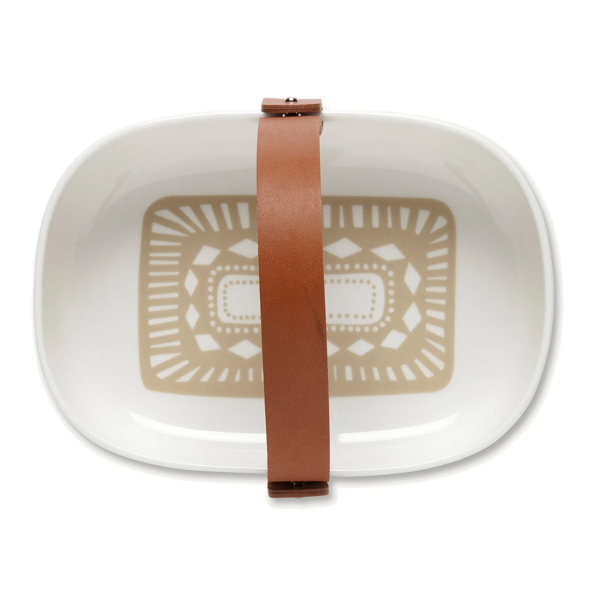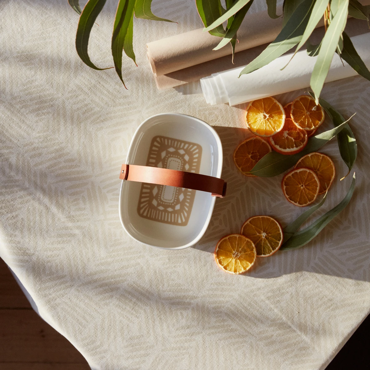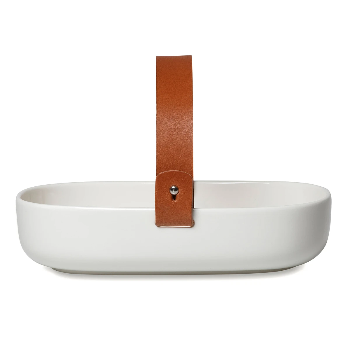 Serve up good cheer with this elegant serving dish. It’s yet another classic design by Sami Ruostsalainen to complete your table setting. You’ll love to pass this serving dish around by it’s rich brown leather handle. It’s clean-lined design and creamy white porcelain will be a beautiful backdrop to whatever you put inside it. As more food is served, more of Sanna Annukka’s Svaale pattern is revealed underneath. Inspired by Eastern European embroidery, the simple, folkloric pattern is a thoughtful and unexpected detail.