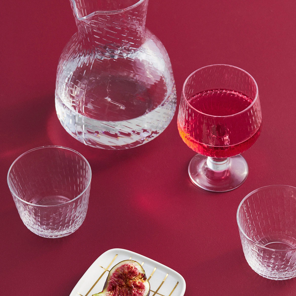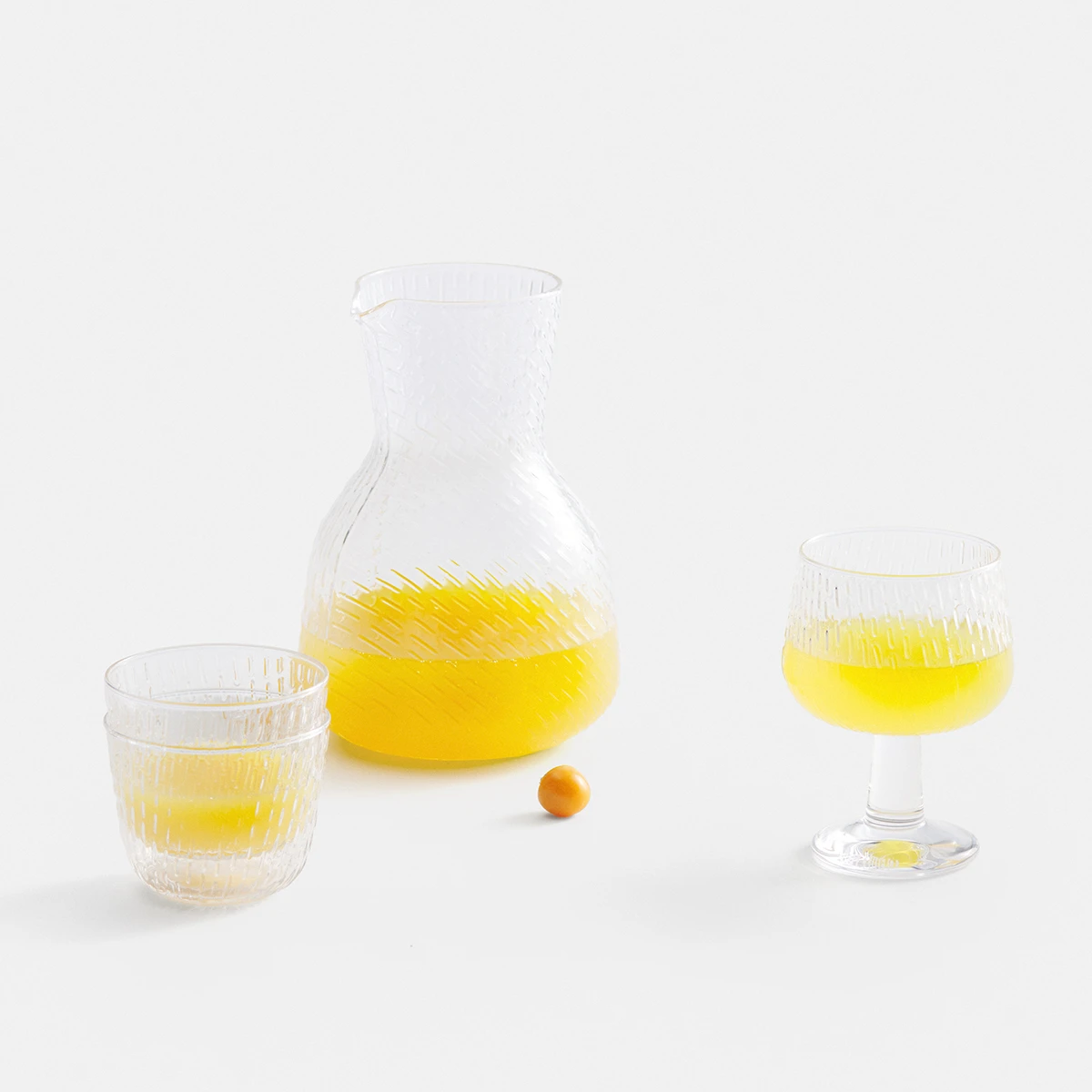 The Marimekko Syksy (Autumn) glass series designed by Matti Klenell explores the nature, weather and shapes of Autumn rain showers. From the gentle fall drizzles to powerful downpours, the organic and textured glass encapsulates the phenomena of this season. Perfect for serving beverages, the Marimekko Syksy Pitcher also acts as a beautiful and elegant kitchen accent. Match with the rest of the Syksy glassware collection for a polished and cohesive set. This product is packaged in a Marimekko logo pattern box.