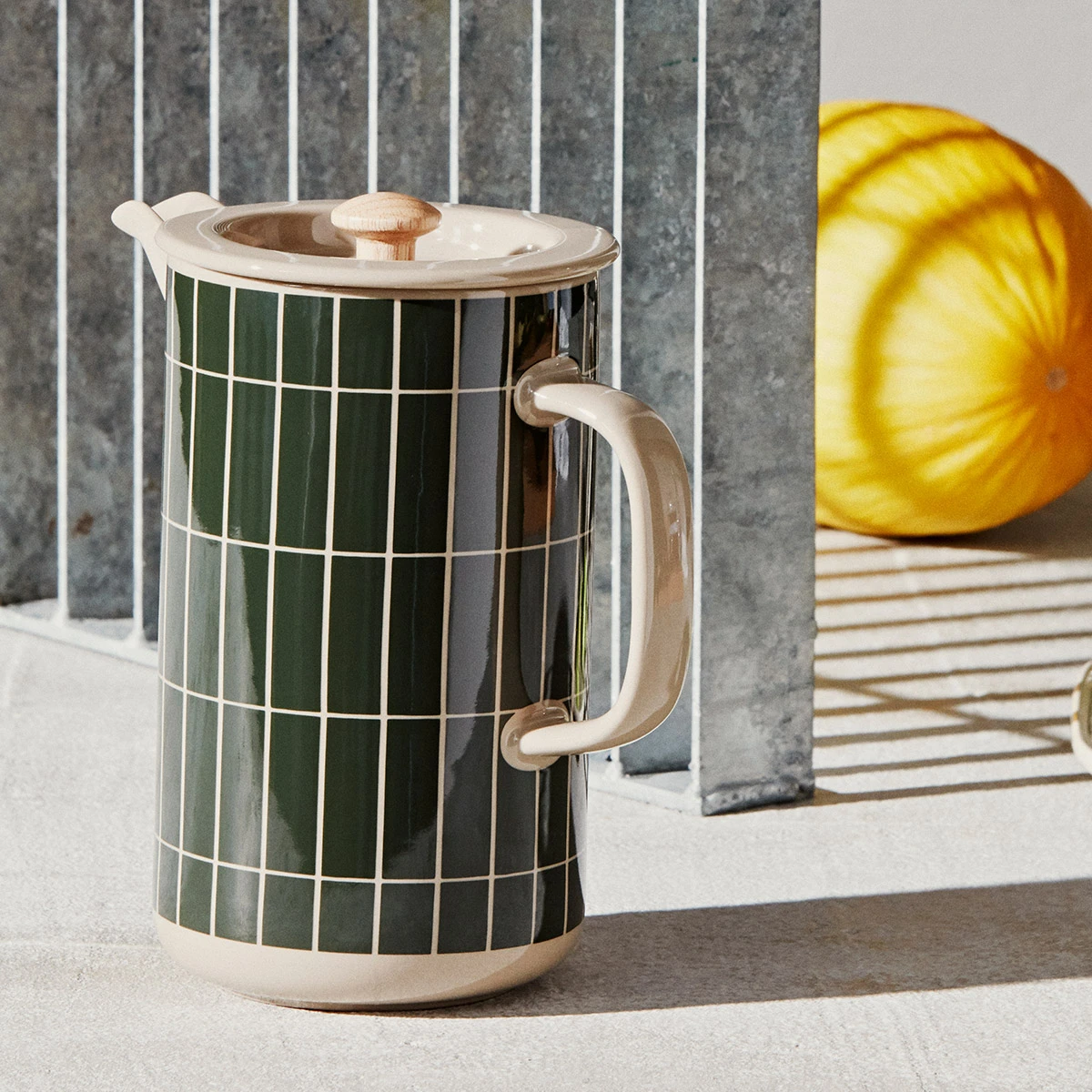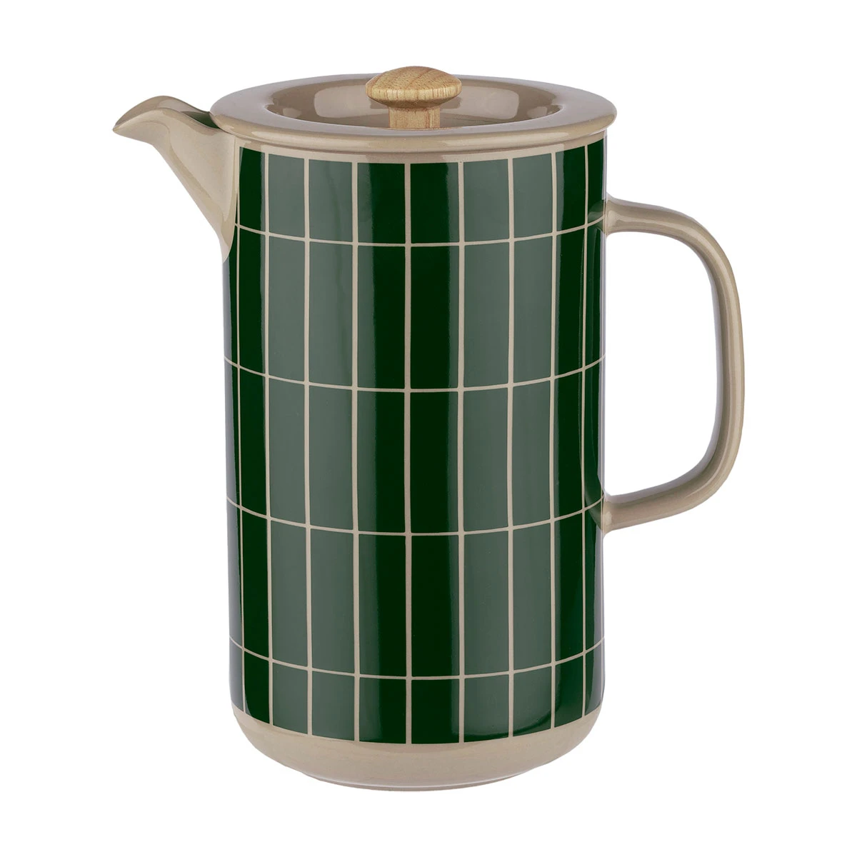 This coffee press features the Tiiliskivi (Brick) pattern designed by Armi Ratia and is made of brown stoneware, which is dishwasher proof. The pattern reflects the simple beauty in everyday life that is all around us. The coffee press has a metal filter inside and makes about six full cups of coffee with each use. The ceramic lid features a smooth wooden knob on top. Enjoy your fresh coffee each morning with this elegant and simplistic coffee press that will never go out of style.