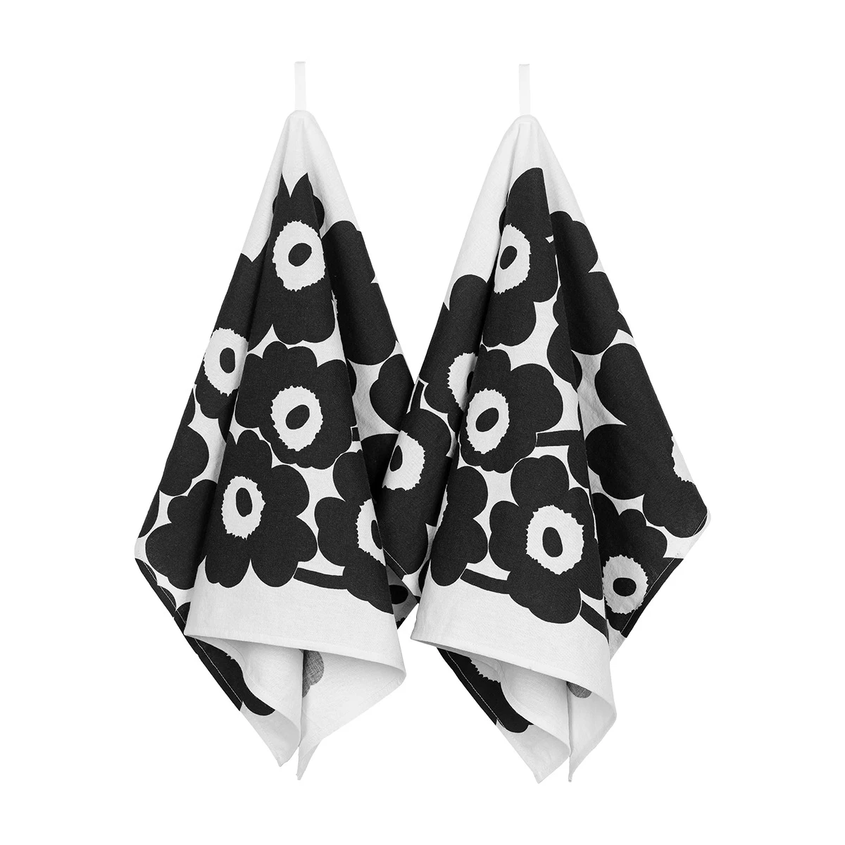 The classic Marimekko Unikko print is printed in black and white on a cotton-linen blend tea towel. It’s the ideal weight and breathability to be draped over rising dough or under drying champagne glasses. Hang the tea towel over a towel bar or by either of the two attached loops—horizontally or vertically—to keep it ready for use and on display.
