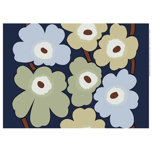 Sage green, beige and sky blue blooms spill over a navy background with the new Marimekko Unikko Navy/Beige PVC Fabric. Great for a simple and fashionable tablecloth, the PVC fabric wipes clean with a damp cloth. Originally designed in 1964 by famed Finnish designer Maija Isola, this iconic print continues to inspire and delight to this day.