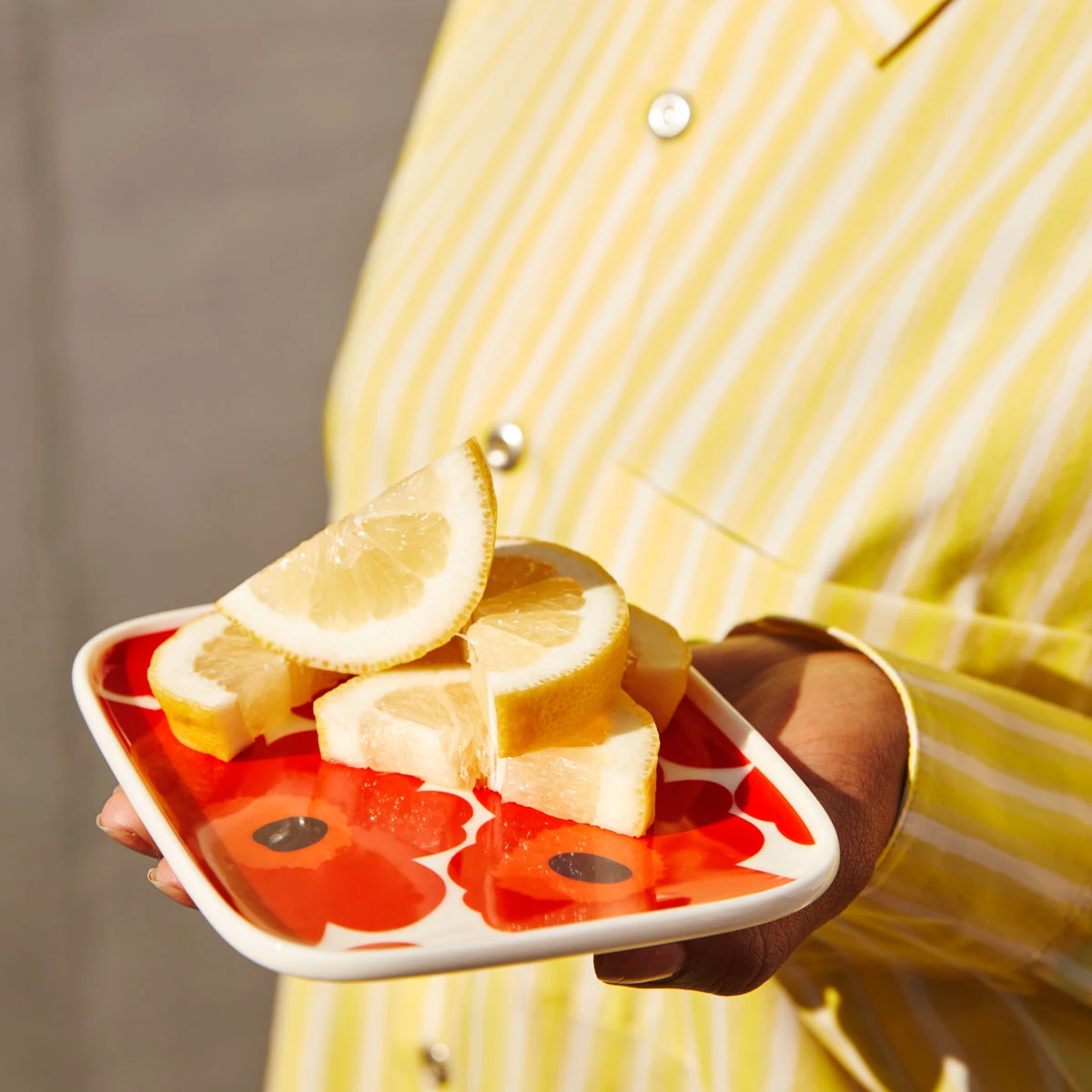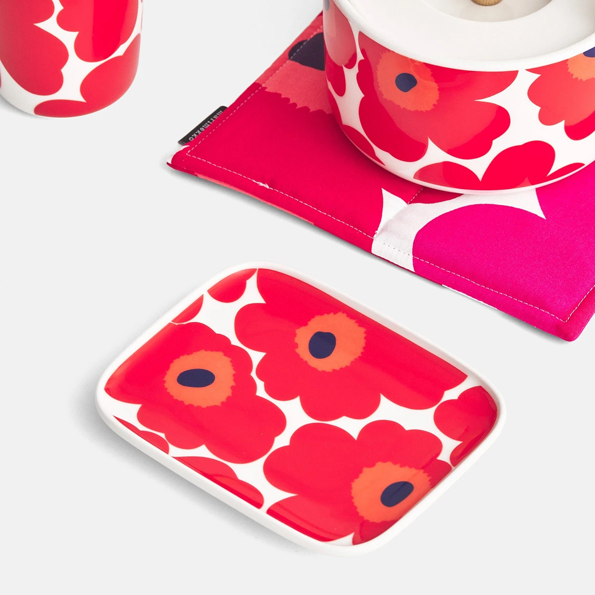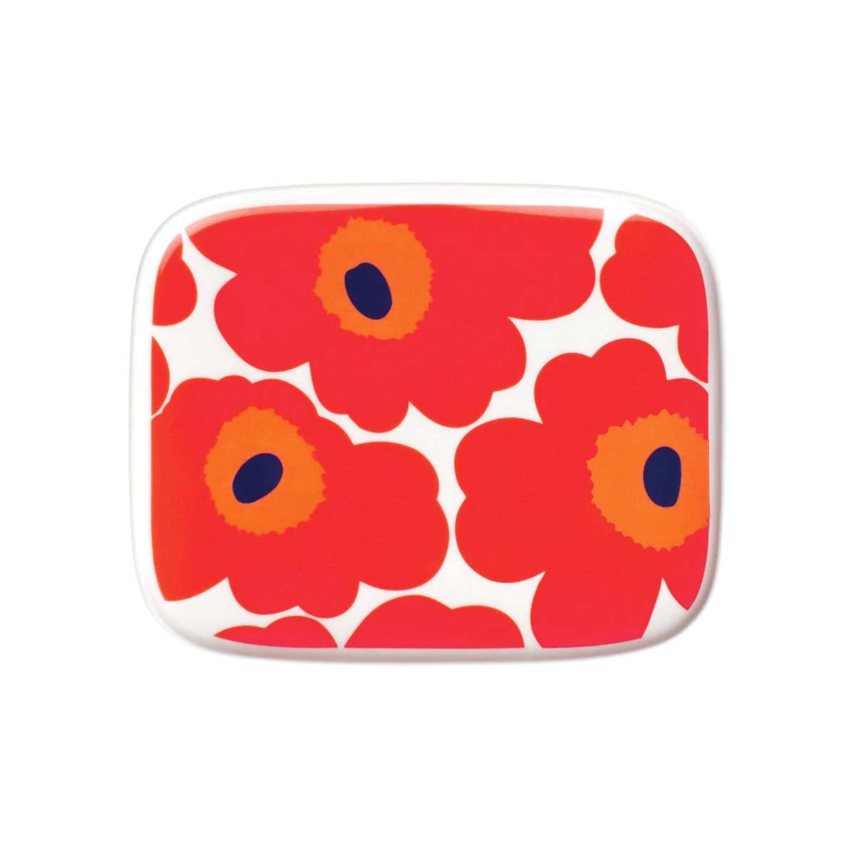 This small rectangular plate boldly complements the Unikko coffee and tea mug, or makes a bright accent to a plain white porcelain cup. The plate has rounded edges and a small lip. Use them as saucers, or alone as appetizer and dessert plates.
