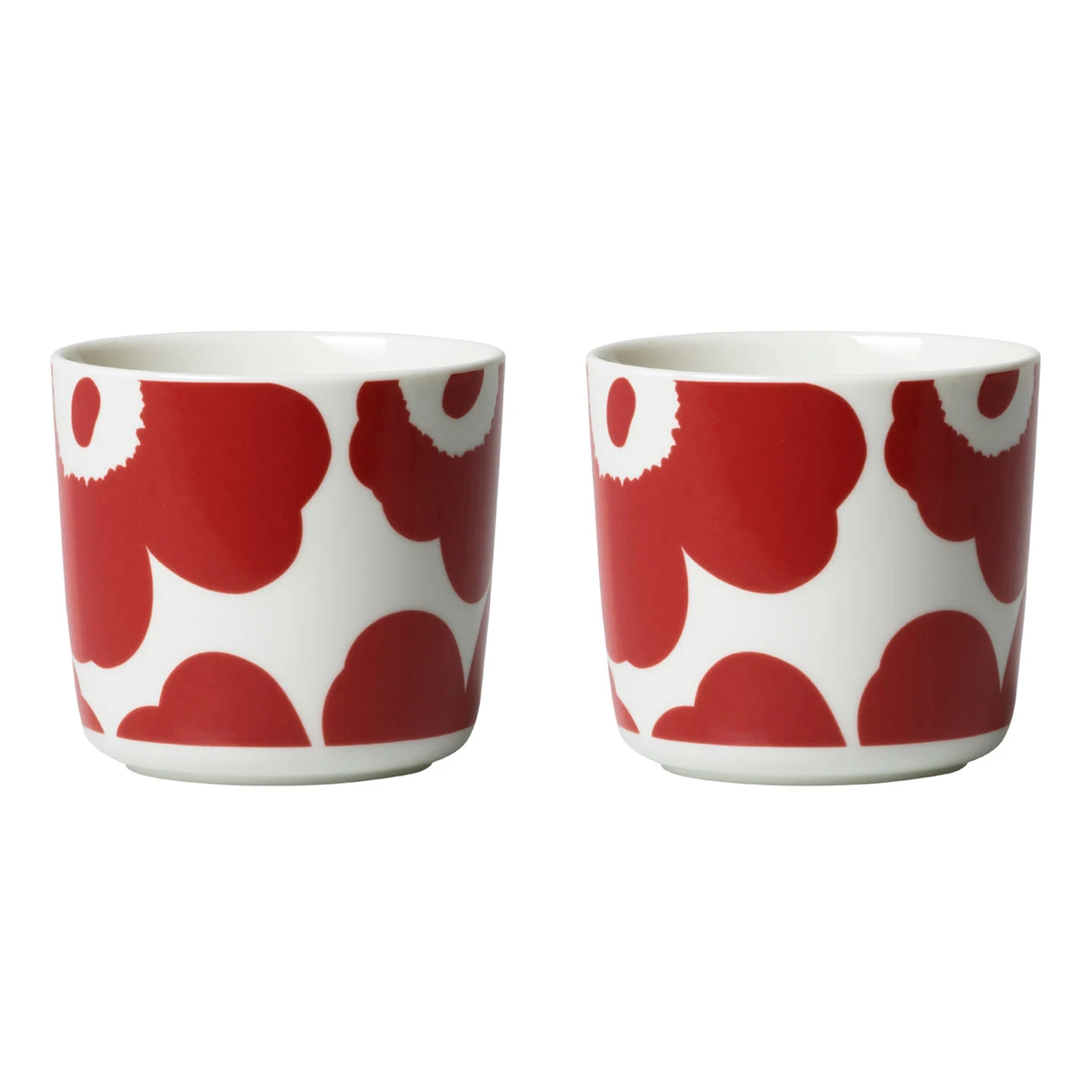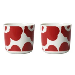 Coffee or tea for two is a beautiful affair with this Marimekko Unikko set. Two matching handleless mugs are dressed in their best poppy print, designed by Maija Isola in 1964. The iconic pattern is minimal, playful, and just a touch festive in shades of white and red. Made from white stoneware, the set is microwave, oven, freezer, and dishwasher safe for convenient daily use. Boxed, it makes an easily-wrapped gift this season.