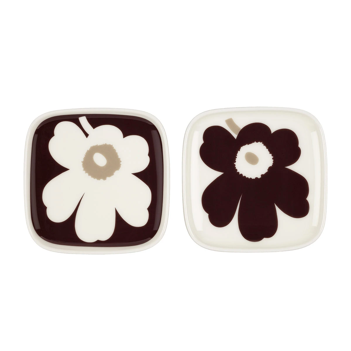 This petite plate set is patterned with the poppies of Maija Isola’s iconic Unikko design. The burgundy (wine), white are in reverse on each plate making these a strikingly stylish little duo. Perfect for small snacks or as a saucer. The white stoneware is microwave, oven, freezer, and dishwasher safe to make it as practical as it is beautiful. Packaged in a Marimekko gift box.