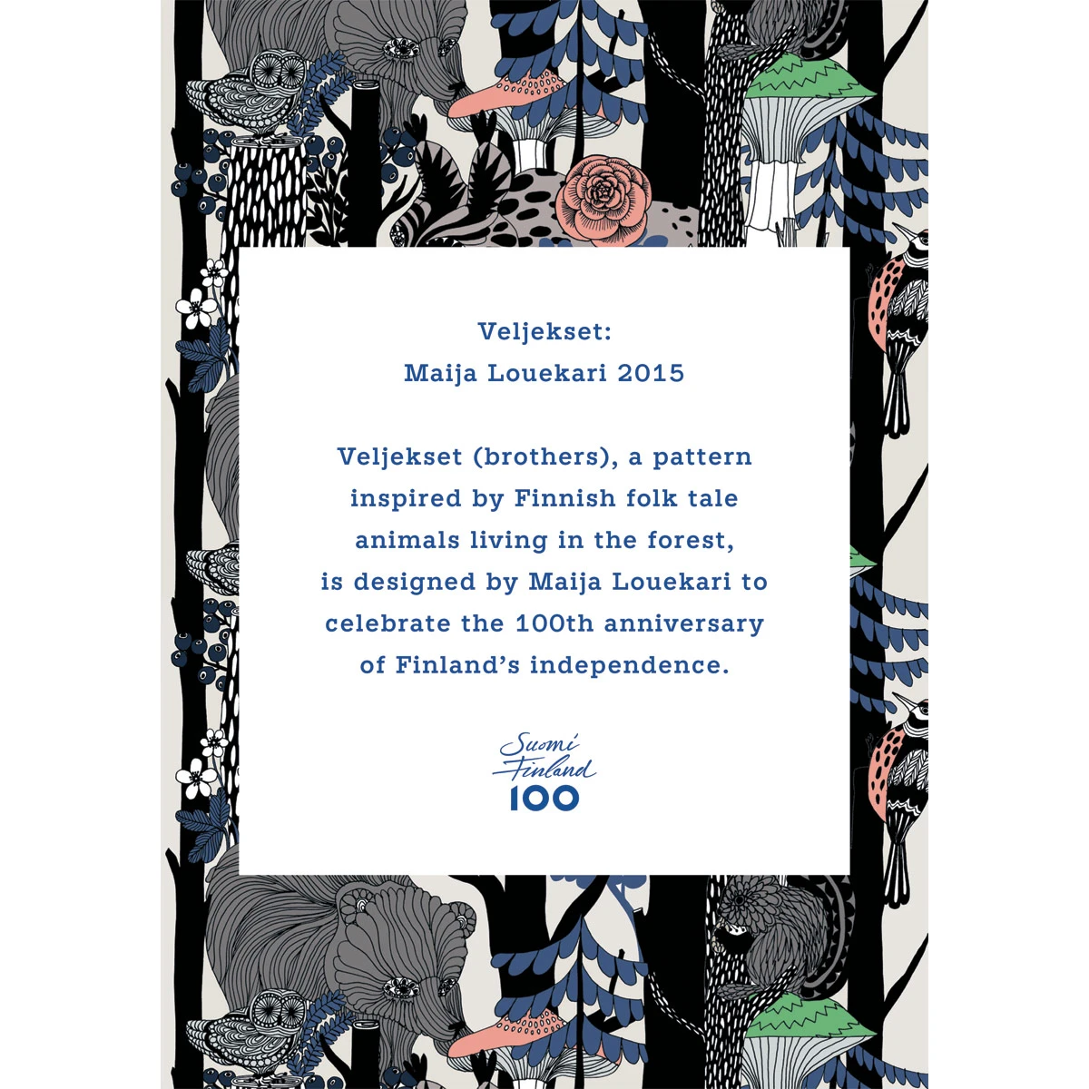 The Veljekset (Brothers) pattern by Maija Louekari celebrates Finland’s 100th anniversary of independence. Inspired by Finnish folk tales, it artfully depicts the wildlife that inhabits the northern country. Printed in Finland on 100% heavyweight cotton, this versatile fabric can be used to craft a curtain, table linen, or wall hanging; wherever way you want to celebrate Suomi.