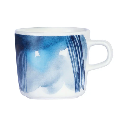 Sleek and smart, the Marimekko Sääpäiväkirja Blue/White Coffee Cup will be a wonderful complement to your coffee or tea. The varying shades of blue watercolors on the cup depict heavy rain clouds that roll into the Finnish archipelago. Designed by Sami Ruotsalainen, this coffee cup can stand on its own or be combined with other pieces from the Weather Diary dinnerware collection. Sip your favorite warm beverage from this petite porcelain beauty.