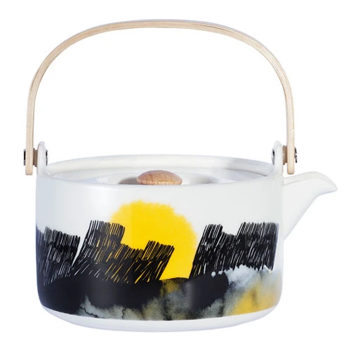 Serve loose leaf tea in style with the Marimekko Sääpäiväkirja White/Black/Yellow Teapot. Sääpäiväkirja is Finnish for “weather diary” and the pattern on the teapot was inspired by seasonal weather changes. An abstract portrayal of dry grass and yellow autumnal meadows on the Finnish archipelago, designer Sami Ruotsalainen worked with a painter to keep his vision of making each piece in the Weather Diary dinnerware collection an individual. This chic teapot is made of vitreous porcelain and includes a matching porcelain tea strainer. Enjoy the crisp fall air with a hot cup of freshly steeped tea from the Marimekko Sääpäiväkirja Teapot.